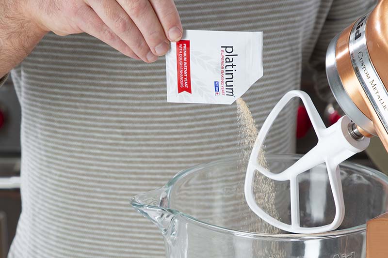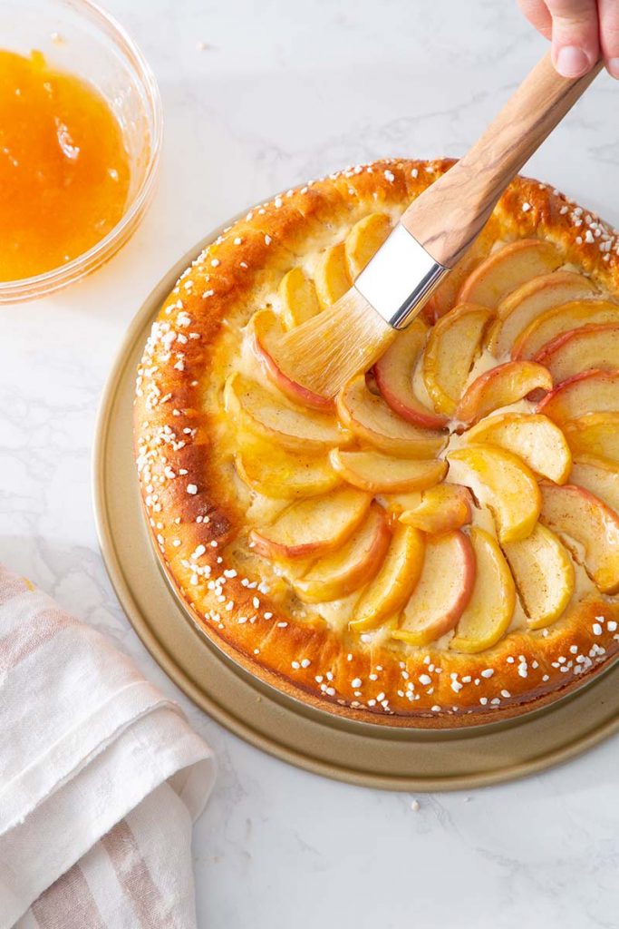 Blog > Apple Cream Cheese Brioche Tart Find A Store Apple Cream Cheese Brioche Tart The beautiful brioche base of this tart gets its incredibly tender and fluffy texture from Platinum Yeast. Topped with a lusciously smooth, warmly spiced cream cheese filling and a fan of sweet, slightly tart Honeycrisp apple slices, this tart is sure to evoke all your favorite fall feelings. Apple Cream Cheese Brioche Video Tutorial Watch video above for a step-by-step tutorial. Scroll down for printable recipe. First, prepare and bake the apple slices. Set aside to cool. Making the brioche takes a bit of time, but the final results are so worth it! Watch the video for lots of tips and tricks. Start by mixing all dough ingredients together — except the butter. Knead until dough is smooth and elastic. Slowly add in the butter, one piece at a time. Once all butter is added, knead until dough is smooth and elastic again. Now it’s time to rise. Roll out dough, shape and rise again. Add cream cheese filling and top with apples. Then egg wash and sprinkle pearl sugar along edge. It’s time to bake! Finish this beauty off by brushing a light coating of apple or apricot jam over the warm apples. It adds a beautiful shine and nice burst of flavor. Slice and enjoy! Forks are optional. Apple Cream Cheese Brioche Tart The beautiful brioche base of this tart gets its incredibly tender and fluffy texture from Platinum Yeast. Topped with a lusciously smooth, warmly spiced cream cheese filling and a fan of sweet, slightly tart Honeycrisp apple slices, this tart is sure to evoke all your favorite fall feelings. Yield 1 (9-inch) Tart Print Recipe Pin Recipe 0 Reviews IngredientsApples2 cups (233g) 1/4-inch-sliced Honeycrisp apples (about 2 medium apples)1 tablespoon (12g) granulated sugar1/2 teaspoon (2.5g) fresh lemon juice1/4 teaspoon apple pie spiceDough2 cups (250g) all-purpose flour, divided1 1/2 tablespoons (18g) granulated sugar1 1/2 tablespoons (21g) firmly packed light brown sugar1 (0.25oz) package (7g) Platinum Yeast1 1/2 teaspoons (4.5g) kosher salt1/4 cup (60g) warm whole milk (120°F/49°C to 130°F/54°C)2 large (100g) eggs, room temperature3/4 teaspoon (3g) vanilla extract1/4 cup (57g) unsalted butter, softenedFilling2 tablespoons (28g) unsalted butter, softened3 tablespoons (36g) granulated sugar2 tablespoons (28g) firmly packed light brown sugar1 teaspoon (4g) vanilla extract1/4 teaspoon kosher salt1/4 teaspoon apple pie spice8 ounces (226g) cream cheese, room temperature1 large (50g) egg, room temperature3 tablespoons (24g) all-purpose flourTopping/Finishing1 large (50g) egg (for egg wash)1 tablespoon (15g) water (for egg wash)Swedish pearl sugar, for sprinklingApple jelly or apricot preserves, optional (see Notes1) InstructionsPreheat oven to 400°F (200°C). Line a rimmed baking sheet with parchment paper. For apples: In a large bowl, stir together apples, granulated sugar, lemon juice, and pie spice. Let stand for 15 minutes, stirring occasionally. Spread apple mixture in an even layer on prepared pan. Bake until apples are fork-tender and have released significant moisture, 12 to 14 minutes, rotating pan and stirring halfway through baking. (Apples will be slightly reduced in size but should still retain their shape.) Let cool on pan on a wire rack. For dough: In the bowl of a stand mixer fitted with the paddle attachment, beat 1/2 cup (62g) flour, granulated sugar, brown sugar, yeast, and salt at medium-low speed until combined. Add warm milk, eggs, and vanilla; beat at medium speed until combined, about 2 minutes, stopping to scrape sides of bowl. With mixer on low speed, gradually add remaining 1 1/2 cups (188g) flour, beating just until combined. Switch to the dough hook attachment. Beat at low speed until dough is relatively smooth, elastic, and starts to pull away from sides of bowl, 6 to 9 minutes, stopping to scrape sides of bowl and dough hook. Add butter, 1 tablespoon (14g) at a time, beating until combined after each addition (6 to 8 minutes total); scrape sides of bowl and dough hook. (Dough may look slightly broken during this process but will come together.) Increase mixer speed to medium-low; beat until a smooth, elastic dough forms, about 6 minutes, stopping to scrape sides of bowl and dough hook. (Dough should pass the windowpane test; see Notes2.)Turn out dough onto a clean surface; knead 4 to 5 times. Shape into a smooth round. Place dough in a large ungreased bowl; cover and let rise in a warm, draft-free place (75°F/24°C) until doubled in size, 45 minutes to 1 hour. (See Notes3.)Preheat oven to 325°F (170°C). Spray a 9-inch springform pan with baking spray with flour. Line bottom of pan with parchment paper.Punch down dough; cover and let stand for 10 minutes. On a lightly floured surface, roll dough into an 11½-inch circle. (Do not flour top of dough.) Using a cake pan or plate, score a 9-inch circle in center of dough. Fold and press outside edges in a diagonal pattern about ¼ inch over score mark to create a crimped edge. Lift dough, and place in prepared pan, making sure dough is even and completely covers bottom of pan. Crimp and secure edges again as needed. Cover and let rise in a warm, draft-free place (75°F/24°C) for 25 minutes. (Dough will be puffed and hold an indentation when poked.) For filling: In the bowl of a stand mixer fitted with the paddle attachment, beat butter, granulated sugar, brown sugar, vanilla, salt, and pie spice at medium speed until well combined. Gradually add cream cheese, beating until smooth. Add egg, beating until combined. Beat in flour until smooth and well combined, stopping to scrape sides of bowl.Using your fingertips, dimple center of dough back down, leaving outside crust as is. Crimp and secure edges again as needed; press out any air bubbles trapped underneath. Spoon and spread cream cheese mixture in an even layer in center of dough. Arrange apples slightly overlapping in two concentric circles. (Discard or save any left