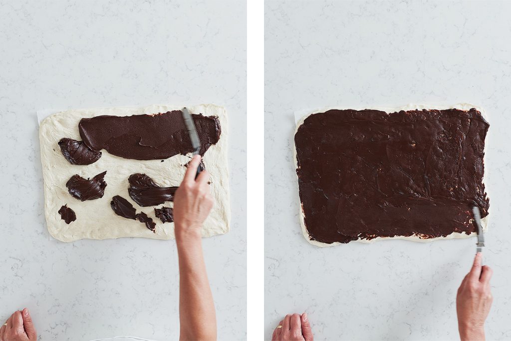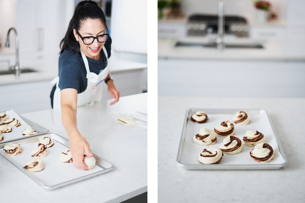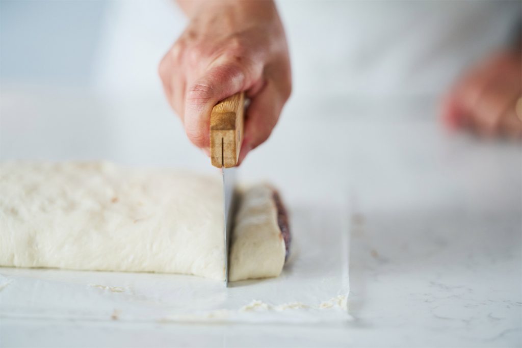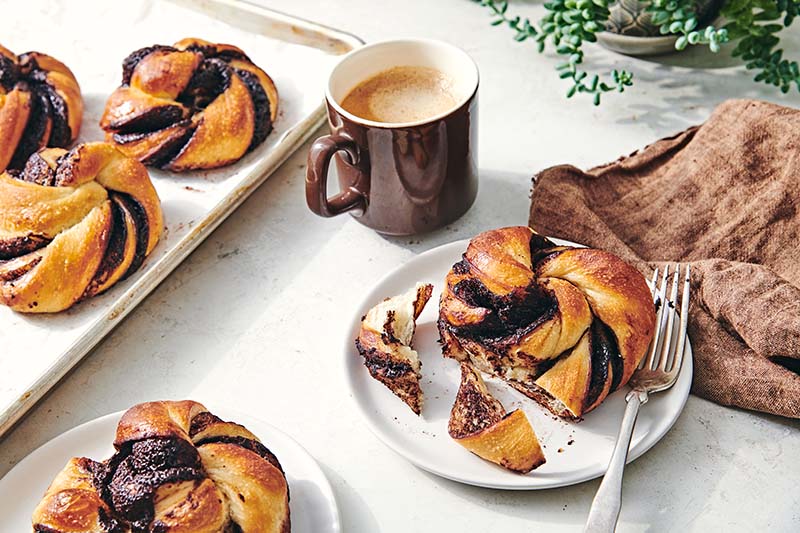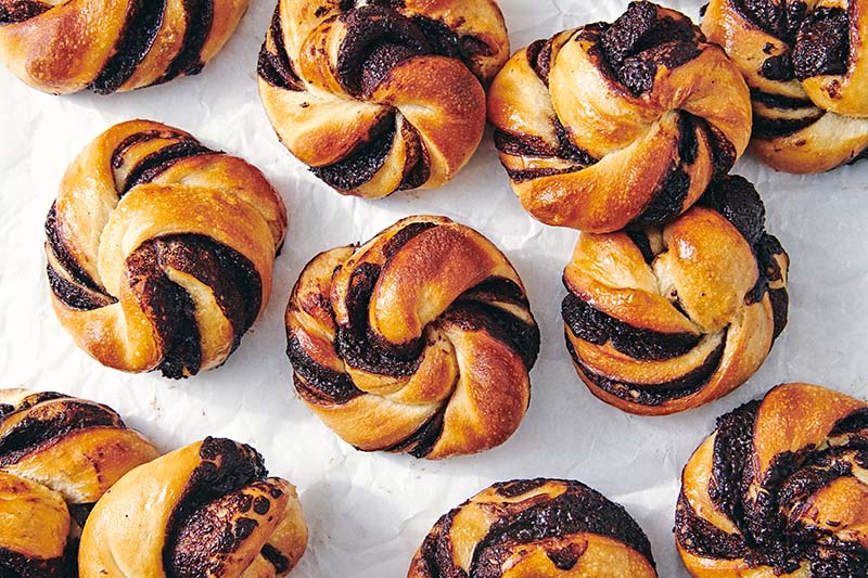 Blog > How To Make Chocolate Twist Buns Find A Store How to Make Chocolate Twist Buns These chocolate twist buns are made with Gesine Prado’s homemade Simple White Bread dough. Gesine used a couple simple ingredient swaps (potato/pasta water and butter) for a softer and richer dough. Swirls of decadent chocolate filling are nestled between layers of soft and fluffy dough for a delicious treat any time of the day! See our Simple White Bread for Beginners blog for step-by-step dough making instructions and video tutorial. Scroll down for printable recipe. Tips for preparing the twists: Baker’s tip: Place rolled out dough onto a piece of parchment paper before chilling. This makes it easier to fold into thirds. Carefully pull the parchment paper off the dough after each fold. Spread the chocolate filling evenly over the rolled out dough. Note: This recipe is easy to customize with your favorite fillings. Try a savory filling for an appetizer or after school snack. Fold bottom third over to the middle, and then fold top third over to middle. Divide dough into 16 equal pieces. Get ready to twist! See video below for a twisting tutorial. Place buns on parchment-lined sheet pans; cover with plastic wrap and let rise. Bake until golden brown. Enjoy! Chocolate Twist Buns Swirls of decadent chocolate filling are nestled between layers of soft and fluffy simple white bread dough for a delicious treat any time of the day! Yield 16 buns Print Recipe Pin Recipe 0 Reviews IngredientsDough2 cups (454g) lukewarm water, about 100℉ (see notes)2 tablespoons (25g) extra virgin olive oil (or soft butter)2 teaspoons (12g) fine sea salt1 tablespoon (10g) granulated sugar5 cups (600g) bread flour1 (0.25oz) package (7g) or 2 1/4 teaspoons Platinum YeastFilling8 ounces baking chocolate (60-70% cacao)1 stick (113g) unsalted butter1/2 cup (57g) confectioners' sugar1/4 cup (21g) Dutch cocoa powderSimple Syrup1/2 cup (113.5g) water1/2 cup (99g) granulated sugar1/2 tsp (2g) vanilla InstructionsIn a large mixing bowl, add the water, olive oil, salt, and sugar.Add the flour to separate bowl and then the yeast. Stir/whisk to combine. Add to the water mixtureUsing a wooden spoon or a Danish dough whisk, stir until most of the flour is absorbed into the dough. Turn the dough over with your hands in the bowl a few times to work in the rest of the flour. The dough will look very shaggy.Turn the dough out onto a lightly floured work surface. Set aside a small bowl of flour (this is called 'bench flour’) to use during kneading as needed.Knead the dough by gently flattening the dough into a rough 8×11-inch rectangle. Grab the top half and fold over, folding the dough in half. Use your palm to push dough forward, "sealing" the dough at the fold seam. Turn the dough 90 degrees and fold, seal and turn again. Knead for 10-12 minutes, or until the dough is shiny and smooth and stays put when shaped into a taut ball. Another way to test if the dough is kneaded enough is to poke it with your index finger, and if the dough springs back it is ready.Place the dough into an oiled bowl and cover with plastic wrap. Allow to double in size in a warm place, about 1 hour.Chill dough: After the bulk fermentation, press the dough into a rough rectangle on a parchment-lined sheet pan sprayed with non-stick spray. Cover with plastic and place in the freezer for 20-30 minutes.Make the filling: Melt baking chocolate and butter in pan on stove (or microwave-safe dish in the microwave), stirring often. Remove pan from stove. Stir in confectioners' sugar and cocoa powder until combined.Remove dough from freezer and place on a lightly floured surface. Roll dough into a 20×12-inch rectangle. Spread chocolate filling evenly over the dough. Fold the dough into thirds to create a 20×4-inch rectangle. Slice into 16 4-inch long strips. Gently stretch each strip and twist. Form into a round by twirling the twisted strip around your finger, then tucking end under. Place on a silicon baking mat or parchment-lined sheet pan. Proof until double in size, approximately 45-60 minutes.Preheat oven to 350˚F.Bake 20-25 minutes, until golden brown.Prepare simple syrup: In a small pan, add water, sugar and vanilla. Heat on stove until sugar is dissolved, stirring occasionally. (Or use microwave-safe dish and heat in microwave.) Set aside until buns are baked.Remove pan from oven. Immediately brush simple syrup over bread. NotesYou can use leftover water from cooking potatoes or pasta for a softer dough. Recipe by Gesine Prado. Did you make this recipe? We want to see it! Tag @redstaryeast and use hashtag #redstaryeast Gesine Prado is a self-taught baker, teacher and author. Visit Gesine’s website for more of her delicious recipes.