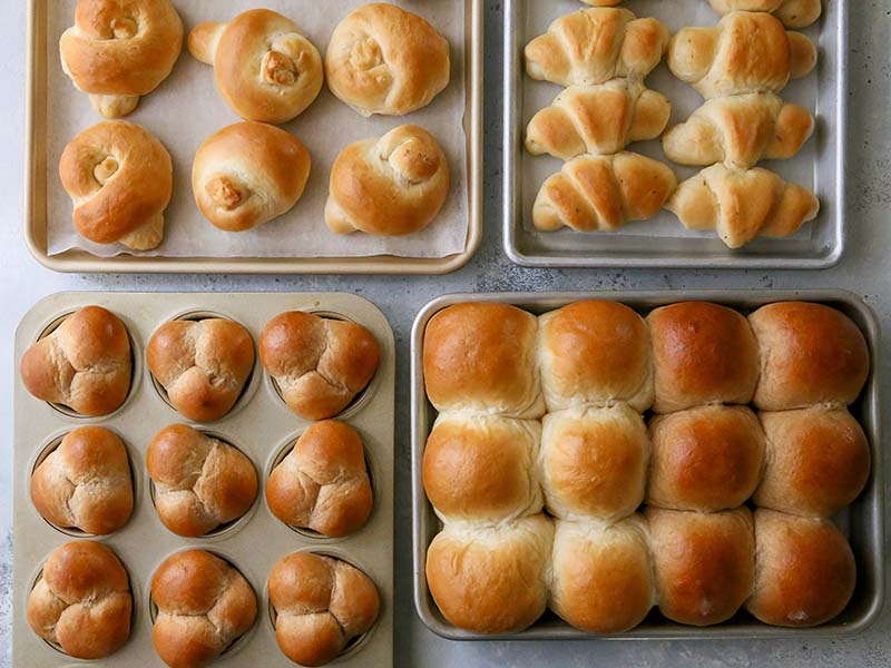 Blog > The Ultimate Dinner Rolls Guide Find A Store The Ultimate Dinner Rolls Guide This is your complete guide to making homemade dinner rolls— from how to make a variety of roll shapes and flavors, to how to prepare rolls ahead of time, and more! Welcome to the ultimate dinner roll guide! Let me show you how to make the most delicious dinner rolls. They’re light and tender, and full of rich buttery flavor. And they’re sure to steal the show at any meal! These yeast-risen rolls require just 7 basic ingredients and are a lot easier to make than you may think. If baking homemade rolls intimidates you, then this tutorial is exactly what you need to get started! This is the only dinner roll recipe you’ll ever need— it’s just one recipe with endless possibilities. Not only are these rolls tender and delicious, but you can make them so many ways! Pictured in those post I have traditional white rolls, honey wheat rolls, and herb rolls. But I also have instructions for a few more flavor variations like cheddar, garlic and “everything” spice. (And psst, you can mix and match flavor combos too!) Classic dinner roll rounds are always a good choice, but I’ll show you how to make other shapes like crescent, cloverleaf, and knots also. The Ultimate Dinner Rolls video tutorial Ingredients you’ll need Let’s get baking! Here’s everything you’ll need to make the best dinner rolls (full recipe at the bottom of the post): Bread flourPlatinum Yeast from Red StarMilkButterEggsGranulated sugarSaltAdd-ins and substitutes for flavor variations, keep reading for more info! Why I bake with Red Star Yeast I’ve been baking and sharing recipes with Red Star Yeast for almost 10 years. It’s the only yeast I use in my baking, and their Platinum® Yeast is my favorite! It’s a premium instant yeast blended with natural dough improvers so dough rises better and faster, and with a higher volume in the finished product. Baking success has never been this easy! Start with the dough To make rolls, first we need to prepare the dough. You can use a stand mixer with a dough hook, or if you plan to knead by hand you can use any large bowl. Note: these instructions show traditional white dinner rolls, if you’re mixing another variety there will be an additional simple step or two. 1. Heat butter and milk. Combine in a small saucepan over medium low heat until butter is melted and mixture is 120-130°F. 2. Combine dry ingredients. Stir some of the bread flour, yeast, sugar and salt in mixing bowl. 3. Add liquids and eggs. Pour warmed milk mixture and eggs into mixing bowl and combine to make a very wet dough. 4. Add more bread flour while kneading. Knead with dough hook or by hand, adding remaining flour a bit at a time, waiting until it is incorporated into the dough before adding more. Stop adding flour when dough mostly clears the bowl and is only slightly sticky to the touch. 5. Let rise. Cover the bowl with plastic wrap and rise in a warm place until doubled, about 1 hour. Now that the dough is prepped, we’re ready to shape it into rolls. How to shape dinner rolls You can’t go wrong with classic round dinner rolls, but sometimes it’s fun to switch things up! Regardless what shape you’re looking to make, I always first make sure all my rolls are portioned to be the same size with the help of a kitchen scale. Once the dough has been portioned evenly, you can shape into: Traditional round dinner rollsCloverleaf rolls— divide each portion into 3 additional portions and shape into rounds. Place 3 rounds in each cup of a greased muffin tin.Knotted rolls— roll and stretch each portion into a 6-8 inch rope. Use your hands to tie into a knot.Crescent rolls— divide dough in half instead of 12 portions. Roll each half to ½ inch thick. Cut into 6 triangular pieces and roll up, starting at the wider end, with the point facing down. For step-by-step instructions and photos, see my post on How to Shape Dinner Rolls. Once rolls are shaped, cover them loosely with a clean towel or plastic wrap and let them rise another 30 minutes until puffy. The final step is to bake the rolls! Bake at 350°F for about 20 minutes, or until rolls are golden brown. Dinner roll flavor variations Honey Whole Wheat Rolls— replace 1½ cups of bread flour with whole wheat flour, sub granulated sugar for ¼ cup honey, and heat with milk and butter. Herb Rolls— add 1 tablespoon fresh (or 1 teaspoon dried) herbs like rosemary, thyme or a combination to the dry ingredients. Cheddar Rolls— stir in 2 cups cheddar cheese to the dough once it has been initially mixed, before adding additional flour. Garlic Rolls— add 2 cloves of minced garlic to the butter and milk as they heat. “Everything” Spice Rolls— a 1 tablespoon everything bagel seasoning to the dry ingredients. Additional spice may be sprinkled over the rolls before baking. Note: feel free to mix and match flavor variations as desired. For example, garlic-herb rolls, whole wheat and cheddar, etc. How to make dinner rolls ahead of time Rise the dough in the fridge overnight— Place kneaded dough in a greased bowl and cover with plastic wrap. Put in the fridge overnight. The next morning, portion and shape into rolls, rise, and bake.Rise the shaped rolls in the fridge overnight— Place shaped rolls in prepared pan and cover with plastic wrap. Put in the fridge overnight. The next morning bring it to room temperature for 1 – 1 ½ hours until risen, then bake.Freeze shaped rolls up to 2 months in advance— Place shaped rolls on a pan lined with parchment paper so they aren’t touching. Cover with plastic wrap and freeze for 1 hour. Transfer frozen rolls to a heavy duty plastic zipper bag and store for up to 2 months. When ready to use, place frozen rolls in prepared pan and thaw at room temperature for a few hours, let rise, then bake.Freeze baked rolls up to 1 month in advance— Bake rolls as normal and cool completely. Wrap in foil and then place in
