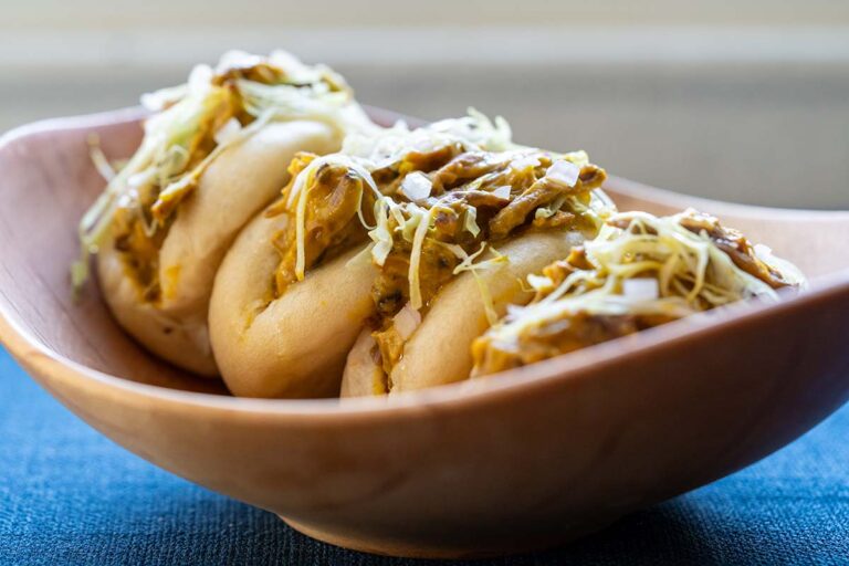 Recipes > Bao Buns (Steamed Chinese Buns) Find A Store Bao Buns (Steamed Chinese Buns) Learn how to make soft and pillowy steamed bao buns with the step-by-step video tutorial by Gesine Prado. Fill with shredded meat and coleslaw for a delicious meal. Yield 24 buns Print Recipe Pin Recipe 0 Reviews Ingredients4 cups (480g) bread flour (I use King Arthur)1 tablespoon (8g) kosher salt1/2 teaspoon baking powder1/2 teaspoon baking soda1 cup (227g) milk (120-130°F)1/2 cup (118g) water (120-130°F)1/4 cup (78g) sweetened condensed milk1/3 cup (61g) duck fat (can substitute with shortening)1 (0.25-ounce) package (7g) or 2 1/4 teaspoons Platinum Yeast InstructionsIn a large bowl, whisk together the flour, salt, baking powder, baking soda and yeast.In the bowl of a stand mixer fitted with the dough hook attachment, add the warm milk, water, sweetened condensed milk and duck fat.With the mixer running on slow, patiently add the flour mixture. Turn mixer to low/medium speed and knead dough until smooth and shiny, about 15 minutes or longer. The dough will be sticky, that is ok.Spray a large bowl with non-stick cooking spray and transfer your dough to the bowl. Spray the top of the dough with non-stick spray as well and cover the bowl with a damp kitchen towel or plastic wrap. Place the bowl in a warm corner of your kitchen to proof until doubled in size, about an hour. Once risen, refrigerate for 20-30 minutes to firm up the dough, making it easier to handle.While the dough is cooling in the refrigerator, cut 24 small squares of parchment about 3×3-inches and place on sheet pans. Spray parchment pieces with non-stick cooking spray.Punch down the dough and turn out onto a clean surface. Divide the dough into thirds and divide each third into 8 EVEN pieces. (You can also weigh the pieces of dough to ensure pieces are equal in size, about 40 grams each). Roll each piece into a tight ball and place on prepared parchment pieces. Cover with plastic wrap and refrigerate (or freeze) for 2 to 3 minutes. This is to cool down dough slightly to make it easier to shape in next step.Remove one dough ball and place on clean surface, seam-side up. With the heel of your palm, or a rolling pin, flatten the dough into an oval. Use fingertips to press out any air bubbles. Starting at the top of the oval, fold dough in half to create a half-moon and press gently along the edges to seal. Place your bun back on the pre-cut piece of parchment on the sheet pan. Repeat with remaining dough balls. Cover with plastic wrap as you work, the buns dry out easily.Once you've folded all the buns and covered them with plastic, allow them to rise until doubled in size, about 1/2 hour.Fill a wok with a few inches of water and bring to a simmer. Place a bamboo steamer over the water. Steam small batches of buns at a time, keeping remaining buns in refrigerator until ready to steam. I have a large bamboo steamer and place 5 buns on each level. Steam for 15 minutes. Continue until you've steamed all your buns. Put aside those buns that you are going to eat immediately. The rest, tightly seal in freezer-safe plastic zipper bags after they have fully cooled and freeze. To refresh the buns after freezing, thaw in the fridge for a 1/2 hour and then steam for a few minutes in a bamboo steamer to perk them up again. NotesRecipe created by Gesine Prado. Did you make this recipe? We want to see it! Tag @redstaryeast and use hashtag #redstaryeast
