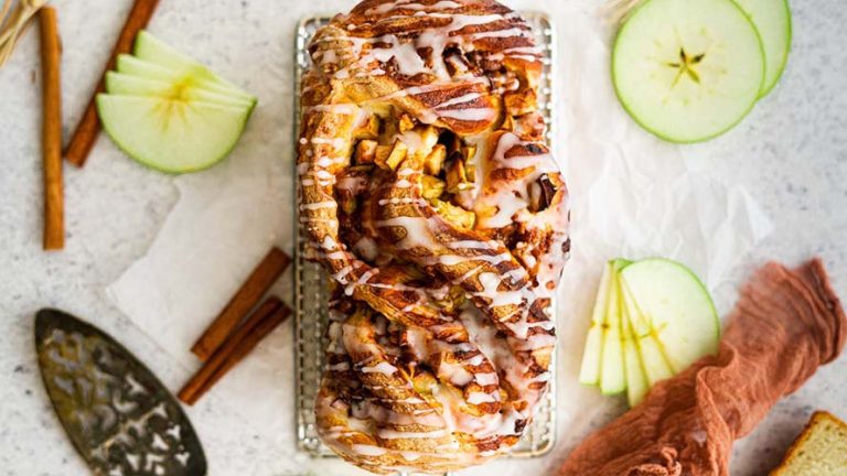 Recipes > Caramel Apple Twist Bread Find A Store Caramel Apple Twist Bread Gooey caramel and apples twisted throughout a soft, fluffy yeasted dough, then topped off with a drizzle of vanilla bean glaze. Filled with fall flavors, this bread is perfect for breakfast or dessert. Yield 2 (8×4-inch) loaves Print Recipe Pin Recipe 0 Reviews IngredientsDough1 (0.25oz) package (7g) or 2 1/4 teaspoons Platinum Yeast3/4 cup (175g) warm milk (about 105°F)2/3 cup (145g) warm water (about 105°F)3 tablespoons (44g) granulated sugar1 large (20g) egg yolk1 teaspoon (5g) Rodelle Gourmet Pure Vanilla Extract1 1/4 teaspoons (6g) table salt4 2/3 cups (555g) all-purpose flour4 tablespoons (56g) unsalted butter, softenedApple Filling1 large (20g) egg yolk1 teaspoon (5g) Rodelle Gourmet Pure Vanilla Extract1 3/4 teaspoons (5g) apple pie spice2 tablespoons (45g) dark brown sugar1 cup (160g) unwrapped caramel bits2 medium Granny Smith apples (peeled and diced small (about 230g prepped))Vanilla Bean Glaze2 cups (240g) confectioners' sugar (10x)Pinch of salt1 teaspoon (8g) Rodelle Vanilla Paste2 tablespoons (33g) water InstructionsMake the dough: In the bowl of a stand mixer fitted with a paddle attachment, add the warm milk and water; stir in the yeast and let sit for 5 minutes. Add the sugar, egg yolk, vanilla extract and salt to the yeast mixture; mix on low speed to combine ingredients. Add 3 cups of the flour and continue to mix on low until flour is incorporated. Add pieces of softened butter, one tablespoon at a time, until it becomes incorporated. At this point switch to the dough hook attachment. Mix on medium-low speed while adding in enough of the remaining flour, about 1/2 cup at at time, to get a soft and slightly tacky dough. Knead until the dough cleans the bottom of the bowl and forms a nice soft ball, about 8-10 minutes. Spray a clean bowl with non-stick spray. Place dough into the bowl and spray top of dough with non-stick spray. Covered bowl with a damp towel, plastic wrap or shower cap. Let dough rise in a warm place until double in size, about 60-75 minutes.Make the filling: Add egg yolk and vanilla to a larger bowl; whisk together. Add brown sugar and apple pie spice; stir to combine. Add caramel bits and apple pieces; stir until well coated. Set aside.Prepare pans: Coat two 8×4-inch loaf pans with nonstick spray or butter. Form loaves: Turn dough out onto a lightly floured work surface. Divide the dough into 2 equal pieces; set one piece aside. cover with damp towel. Roll dough out into a 10×15-inch rectangle. Divide the filling in half and spread half evenly over the rolled out dough, leaving a 1-inch border on all sides. From the short side, roll the dough up tightly (like a cinnamon roll) into an even shaped log, pinching seam to seal. Cut the log down the center, long ways. With the cut sides facing upwards, gently twist the 2 pieces together to create a twisted loaf, being careful to keep the filling from falling out. Place loaf into prepared pans with the cut sides facing upwards; cover with plastic wrap. Repeat shaping with other dough piece.Let loaves rise until slightly domed over top of pan, about 45-60 minutes.Preheat oven to 350°F.Bake for 55-65 minutes or until an internal temperature of 210°F. (If you are using a dark or coated metal pan, lower temperature to 325°F for the same duration.)Turn out the loaves onto a cooling rack; cool for at least an hour before glazing.Prepare vanilla bean glaze: In a bowl, whisk all ingredients together until well combined. Drizzle half of the glaze over each cooled loaf. NotesRecipe created in partnership with Rodelle by Phil Stepler, part of ADM’s Culinary Team. Photography by Amanda Hobbs. See recipe variations below. Did you make this recipe? We want to see it! Tag @redstaryeast and use hashtag #redstaryeast Recipe variations: Apple Twist Morning Buns | Olive and Artisan Chunky Apple Bread | Rodelle