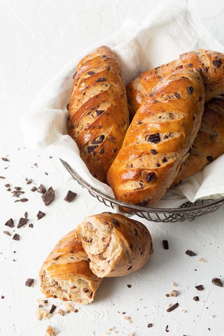 Recipes > Chocolate Cherry & Pistachio Viennoise Find A Store Chocolate Cherry & Pistachio Viennoise Usually enjoyed for breakfast, Viennoise is a special baked good that blends the pleasures of soft milk bread with the buttery richness of brioche. Our enriched dough filled with chocolate, cherries, and pistachios receives a divinely fluffy texture from Platinum Yeast from Red Star. Yield 7 rolls Print Recipe Pin Recipe 0 Reviews Ingredients1/3 cup (80g) warm water (110°F/43°C to 115°F/46°C)1/4 cup (60g) warm whole milk (110°F/43°C to 115°F/46°C)1 (0.25oz) package (7g) Platinum Yeast1/4 cup (50g) granulated sugar, divided3 1/4 cups (406g) all-purpose flour, divided2 1/2 teaspoons (7.5g) kosher salt (see note 1)3 large (150g) eggs, room temperature and divided5 tablespoons (70g) unsalted butter, room temperature (see note 2)1/3 cup (53g) finely chopped bittersweet chocolate 1/3 cup (43g) finely chopped dried sweetened cherries1/4 cup (32g) finely chopped dry-roasted salted pistachios InstructionsIn a small bowl, stir together ⅓ cup (80g) warm water, warm milk, yeast, and 1 teaspoon (4g) sugar. Let stand until foamy, 5 to 10 minutes.In the bowl of a stand mixer, whisk together 2¾ cups (344g) flour, salt, and remaining 3 tablespoons plus 2 teaspoons (46g) sugar. Add yeast mixture and 2 eggs (100g); using the paddle attachment, beat at low speed until a shaggy dough forms. Scrape sides of bowl.Switch to the dough hook attachment. Beat at low speed until dough is smooth and elastic, about 6 minutes; add up to ¼ cup (32g) flour, 1 tablespoon (8g) at a time, if dough is too sticky. Add butter, 1 tablespoon (14g) at a time, beating until combined after each addition (about 5 minutes total). Beat until a smooth, slightly tacky, and elastic dough forms, 9 to 10 minutes; add up to remaining 1/4 cup (32g) flour, 1 tablespoon (8g) at a time, if dough is too sticky.In a small bowl, stir together chocolate, cherries, and pistachios. Add to dough, and beat at low speed until just combined, stopping to scrape sides of bowl and dough hook. Turn out onto a lightly floured surface, and knead 3 to 5 times to ensure mix-ins are evenly distributed. Shape dough into a smooth round.Lightly oil a large bowl. Place dough in bowl, turning to grease top. Cover and let rise in a warm, draft-free place (75°F/24°C) until doubled in size, 45 minutes to 1 hour.Punch down dough, and let stand for 10 to 15 minutes. On a lightly floured surface, divide dough into 7 portions (about 127g each). Press each portion into a disk about ¾-inch thick. Working clockwise around each disk, fold edges toward center to form a ball. Turn dough seam side down. Cover and let stand for 15 to 20 minutes.Line a baking sheet with parchment paper.On a lightly floured surface, place 1 dough ball seam side up, and press into a 3¼-inch-wide disk. Starting with top edge, fold dough, about ½ inch at a time, pressing to seal after each fold. Repeat until you have a tight cylinder. Roll seal to bottom, and using both hands, gently roll from center out toward ends, lengthening dough as you go and tapering ends. Dough should be 7 inches long. Repeat with remaining dough. Place, seam side down, about 2 inches apart on prepared pan. Cover and let rise in a warm, draft-free place (75°F/24°C) until doubled in size, 45 minutes to 1 hour.Preheat oven to 375°F (190°C).In a small bowl, lightly whisk remaining 1 egg (50g). Brush tops and sides of each roll with egg wash. Using a lame or a sharp paring knife, score tops with small diagonal cuts, about ½ inch apart.Bake until an instant-read thermometer inserted in center registers 190°F (88°C), 10 to 12 minutes. Let cool on pan for 10 minutes. Serve warm, or remove from pan, and let cool completely on a wire rack. Notes Salt weight and volume vary by brand. Diamond Crystal kosher salt was used in this recipe (1 tablespoon is 9 grams). If you a have different brand or type of salt, use the weight listed in the recipe, not the volume measurement. If you do not have a scale, check your brand’s website for what the equivalent volume measurement is for the weight listed in this recipe. Unlike softened butter, room temperature butter should provide no resistance when pressed with a finger. At this point, the butter is soft enough to easily incorporate into your dough. Recipe by Bake From Scratch. Did you make this recipe? We want to see it! Tag @redstaryeast and use hashtag #redstaryeast