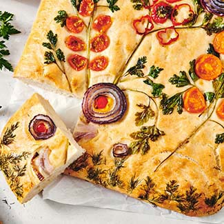 Recipes > Decorated Focaccia Find A Store Decorated Focaccia Decorate this easy-to-make focaccia with your favorite veggies for a delicious side to your dinner, or serve with olive oil for an appetizer or snack. Print Recipe Pin Recipe 0 Reviews IngredientsAutolyse5 3/4 cups + 1 tablespoon (700g) unbleached all-purpose flour2 1/2 cups (300g) unbleached bread flour (see note 1)2 3/4 cups + 1 tablespoon (650g) water (80-85˚F/27-29˚F)Dough1/3 cup (50g) water (80-85˚F/27-29˚F)1 (0.25-ounce) package (7g) or 2 1/4 teaspoons Platinum Yeast1/4 cup + 1 1/2 tablespoons (55g) extra virgin olive oil1 tablespoon (15g) fine sea saltToppings6 tablespoons (84g) plus more as needed extra virgin olive oilVegetables, sliced for decoration (suggestions: mini sweet bell peppers, red onion, heirloom cherry tomatoes, black olives, fresh parsley and dill) InstructionsMake the Autolyse: Add both flours and water to a large bowl or Cambro bucket. Mix with a Danish dough whisk or wooden spoon until the flour and water are completely combined. You may need to use your hands a bit at the end to make sure there is no dry flour left; the dough will be rough and shaggy. Cover with plastic wrap and allow to sit at room temperature for 30 minutes to 1 hour, until dough is soft and elastic.Make the Dough: Add the yeast to the water, stir to combine. Add yeast mixture, olive oil and salt to the autolyse.Use your hands in a pincer-like manner (see video, linked below) to combine the added ingredients into the autolyse. (Note, you can also use a mixer on low for this process.) The water and oil will slop around for a bit without combining, so be patient. This may take a few minutes to fully combine. When the dough has come together but still a little shaggy, it is time to knead. Knead dough until smooth and elastic. Note, because this is a wet dough, the "slap and fold" method of kneading is ideal (see video, linked below). Shape dough into a tight, round ball.Place dough ball in an oiled bowl, turning to coat all sides of dough with oil. Cover with plastic wrap. Let dough rise at room temperature until doubled in size, about 45-60 minutes. (See note 2 for optional overnight rise.) Prepare ½-sheet pan: Add about 3 tablespoons of olive oil to pan, spreading around to evenly coat pan.Transfer dough to prepared pan. Coat your fingers with olive oil. Use fingertips to dimple and spread the dough evenly in pan as close to the edges as the dough allows. It doesn't need to fill the entire pan; the dough will continue to expand outwards and upwards while it rises. Drizzle the remaining 3 tablespoons of olive oil over the top of the dough and gently spread it evenly over dough.Cover and let rise in warm place until dough reaches the top edge of the ½-sheet pan, about 1 hour. (If the dough was in the refrigerator overnight, the rise time may be longer due to the colder dough temperature.)Prepare vegetables: Slice vegetables and place on parchment paper in desired arrangement. (See video for detailed instructions, ideas and tips – linked below.)Preheat oven to 375˚F/190˚C.Once dough has risen, remove plastic wrap. Transfer vegetables to the focaccia, gently pressing them into the dough once in the proper place. When the design is complete, lightly brush olive oil over all the vegetables.Bake for 20-25 minutes or until the dough is golden brown and crisp on top and bottom. Notes If you don’t have bread flour, you can use all all-purpose flour (8¼ cups/990g total flour). Leave out the remaining ⅓ cup/50g of water in the dough. Optional Overnight Rise: In step 5, after dough is in covered bowl, place in refrigerator overnight (do not let it rise to double in size, just place in refrigerator), about 8 hours. This longer rise creates loads of flavor. When ready, continue with step 6. Recipe created by Gesine Prado. Did you make this recipe? We want to see it! Tag @redstaryeast and use hashtag #redstaryeast Watch Gesine’s video below for a step-by-step recipe guide. — BLOG — How to make Decorated Focaccia Get the step-by-step recipe and shaping video tutorial. Go To Blog