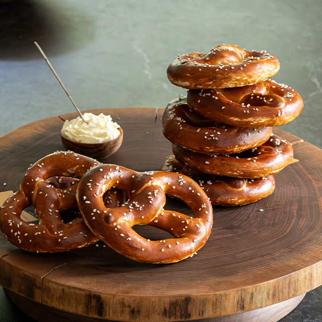 Recipes > Gesine’s Bavarian Pretzels Find A Store Gesine’s Bavarian Pretzels Celebrate Oktoberfest with homemade Bavarian soft pretzels! These authentic German pretzels are a must-try recipe. The 6-ingredient yeast dough uses barley malt syrup to give a rich, hearty flavor. Soak the giant pretzels in a lye bath before baking to achieve the classic, deep, golden-brown color. Yield 12 pretzels Print Recipe Pin Recipe Read the Blog 0 Reviews IngredientsDough5 1/4 cups (630g) unbleached bread flour (King Arthur brand was used)1 (0.25oz) package (7g) or 2 1/4 teaspoons Platinum Yeast1 1/3 cups (315ml) cold water (40-45°F)1 1/2 tablespoons (31g) barley malt syrup (light brown sugar can be substituted)1 teaspoon fine sea salt2 tablespoons (28g) unsalted European butter or lard, room temperature, cut into piecesLye Bath500 grams cold water20 grams food-grade lye(See notes for alternative baking soda bath instructions)ToppingsPretzel or Rock Salt (as desired) InstructionsMake the dough: In a medium bowl, add the flour and yeast; whisk to combine. Set aside. (Note: if using a baking soda bath in place of a lye bath, refer to the notes below to create the bath as step 1 – then proceed to make the dough.)In the bowl of a stand mixer fitted with a dough hook, add the water, barley malt syrup and salt. Add the flour-yeast mixture and mix on low speed (speed 1) until the dough just comes together, about 1 minute. While mixer is still going, add the butter pieces; mix until the butter is completely incorporated. Increase mixer speed to medium (speed 4-5) and continue mixing for 10-15 minutes or until the dough is shiny, smooth and elastic.Bulk rise: Spray a large bowl with non-stick cooking spray and transfer the dough to the bowl. Spray the top of the dough with non-stick spray; cover bowl with plastic wrap and set in a warm place. Allow dough to bulk ferment for 20-30 minutes. To make shaping easier, after the rise, place dough in the refrigerator for up to 30 minutes to firm it up.Divide dough: Turn dough out onto a clean work surface. Press dough gently with fingertips to degas. Divide the dough into 12 equal portions (about 84 grams each). Gently roll each piece into a cigar-shaped log, about 8-9 inches long; cover dough with plastic wrap. Let the pieces rest for 10 minutes.Prepare baking pans: Line two ½-sheet pans with a silicone baking mat or parchment. Coat with non-stick cooking spray. Set aside.Shape the pretzels: With the palms of your hands, roll and stretch each piece into a 24 to 26-inch rope of even thickness throughout. Form the dough into a U shape; crisscross the ends twice, leaving the remaining ends 3 inches long. Bring the ends to the lower sides of the U shape and press ends to secure. Stretch the pretzel to even out its shape. (View step-by-step pictures in the Bavarian pretzel tutorial).Place shaped pretzel on the prepared sheet pan; cover with plastic wrap. Continue shaping the remaining dough. Place covered dough into the freezer to stiffen the pretzels, about 5-10 minutes. (Note, this may take a bit longer if your freezer is very full or not as cold; you want the dough to be slightly firm but NOT frozen.)Preheat oven to 425˚F.Prepare the lye bath: Please note, safety is of utmost importance when using lye. Please follow the instructions carefully. We recommend watching the video tutorial for more tips on using the lye bath before proceeding. (Instructions for using an alternate baking soda and egg wash method in place of a lye bath can be found in the notes below this recipe.)Cover your work station in parchment paper. Wear eye protection and rubber or latex gloves. Wear long sleeves to cover arms.Add cold water in a non-reactive bowl (stainless steel works best) and then slowly add the lye; stir to dissolve. The chemical reaction will warm the mixture, so allow to cool before dipping the pretzels, about 5 minutes. Soak the pretzels in the lye bath: Transfer the stiffened pretzels to the bath, one at a time, and let soak for 5 seconds on each side (no more than 10 seconds total). Place the pretzels on a stainless steel cooling rack that is resting on a parchment-lined baking sheet to catch any excess solution. Carefully dispose of the lye bath by slowly pouring solution down the drain of your kitchen sink. Toppings: Transfer the pretzels back to the prepared sheet pans. Sprinkle salt over top of pretzels, as desired.Bake: Bake for 16-20 minutes, until deep, golden brown. NotesFor a more authentic texture and darker color, we recommend using a lye bath. As an alternative, you can soak the pretzels in a baking soda bath. Baking soda bath: 2 cups water 1/4 cup baking soda Egg wash: 1 egg whisked with 1 tablespoon water Prepare the baking soda bath: (Do this before step 1 of the recipe to allow mixture to cool to room temperature.) Bring 2 cups of water to a boil and pour into a heatproof bowl that is large enough to hold one pretzel. Stir in the baking soda, mix until completely dissolved. Let the mixture come to room temperature. Continue with recipe through step 10. Step 11: Soak the pretzels in baking soda bath: Make sure each pretzel is firm before dunking each piece into the baking soda bath. Dip pretzels, one at a time, in the bath for 5 seconds, then turn over and soak for 5 seconds more. Place pretzels on cooling rack that is resting on a baking sheet to allow excess water to drip off. For added shine and color, brush each pretzel with egg wash. Continue with step 12 of recipe. Recipe created by Gesine Prado. Did you make this recipe? We want to see it! Tag @redstaryeast and use hashtag #redstaryeast — BLOG — How to make Gesine’s Bavarian Pretzels Get the step-by-step recipe and shaping video tutorial. Go To Blog